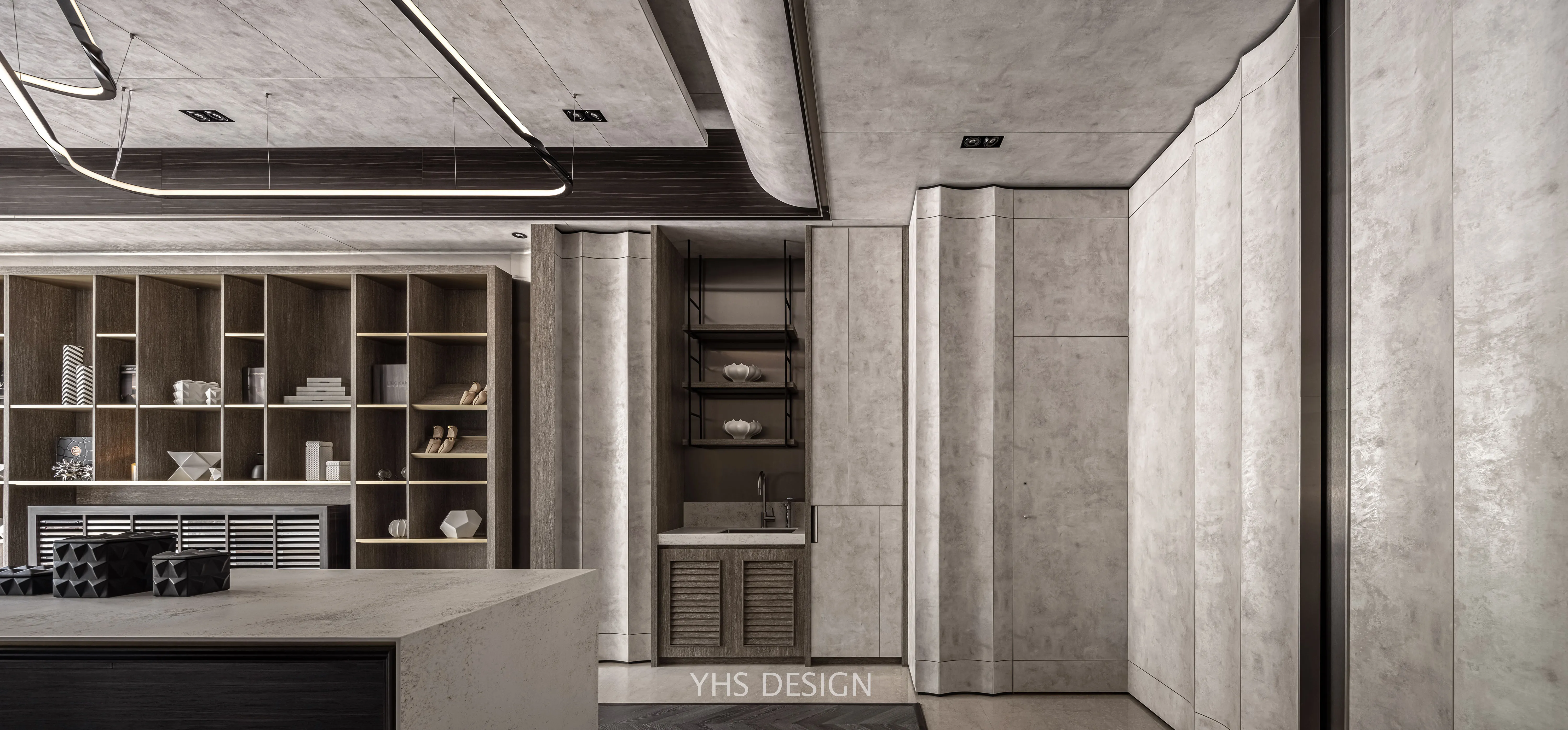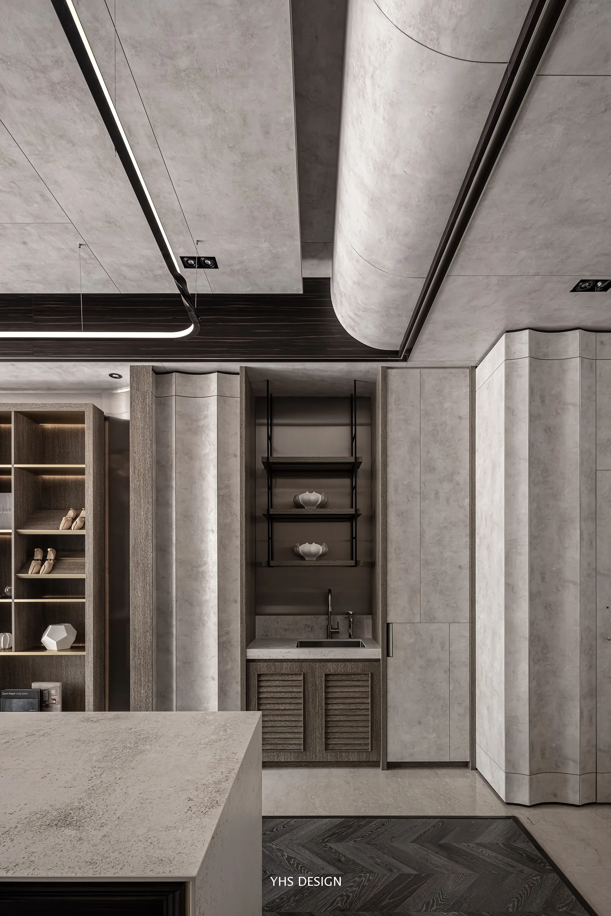 細緻花藝揭開美好空間序幕,溫潤木質感結合柔美燈光營造適意氛圍,而理性石材的豐美肌理與觸感,則表現出細膩光澤和視覺層次。以天花上兩弧形造型為出發點,將8mm的系統板材以薄背切、彎折的方式達到曲線效果和折線造型,再延伸至牆面,巧妙發揮系統板材的可能性、重新定義也突破既有印象,實現工藝精神與設計構想,打造出飽滿質感卻自由無束的獨特樣貌。