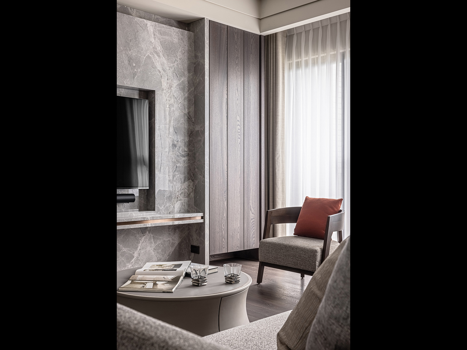 優雅溫潤的米、灰色調做為色彩基底,注入深色框體更顯沉穩舒適,搭配金屬線條勾勒美感,木紋、布料與大理石紋路豐富空間表情,同時保留場域大面採光及自然景致,使陽光透過細沙布簾輕輕穿透,讓自然融入空間和生活,期望打造一處令身心恬靜的居住空間,能靜心享受細緻的設計和生活態度。